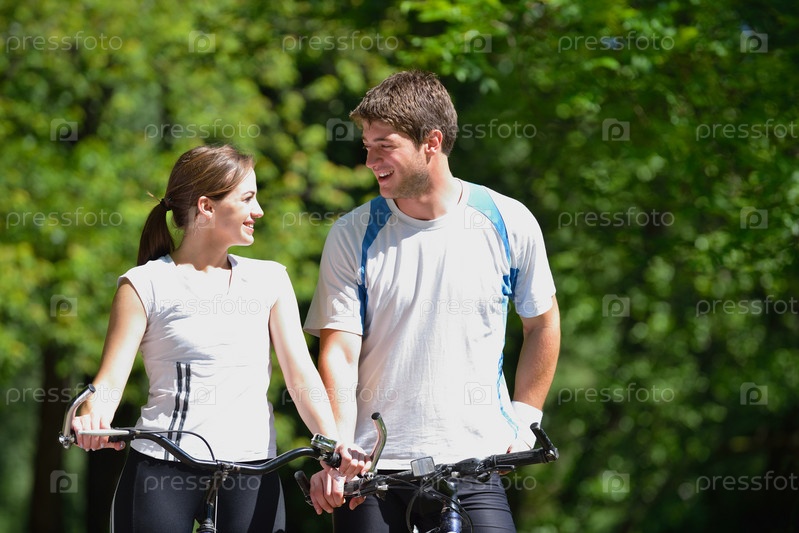 Счастливая пара катается на велосипедах на природе. Концепция спорта, развлечения, любви и романтики