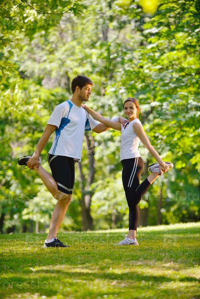 Молодая здоровая пара делает растяжку и раззминку после пробежки в парке