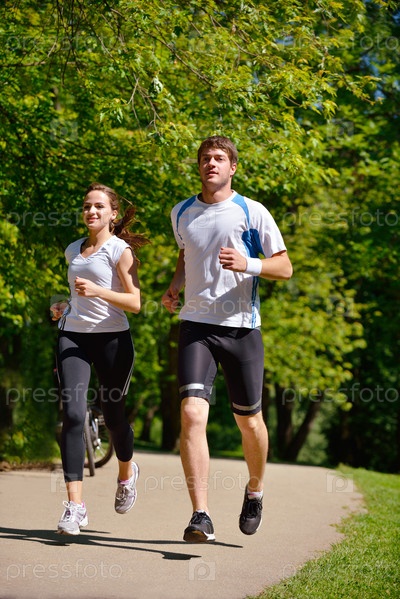Молодая пара на утренней пробежке в парке. Здоровье и фитнес