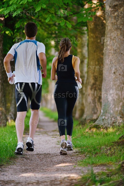 Молодая пара на утренней пробежке в парке. Здоровье и фитнес