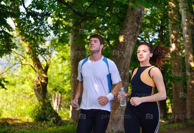 Молодая пара на утренней пробежке в парке