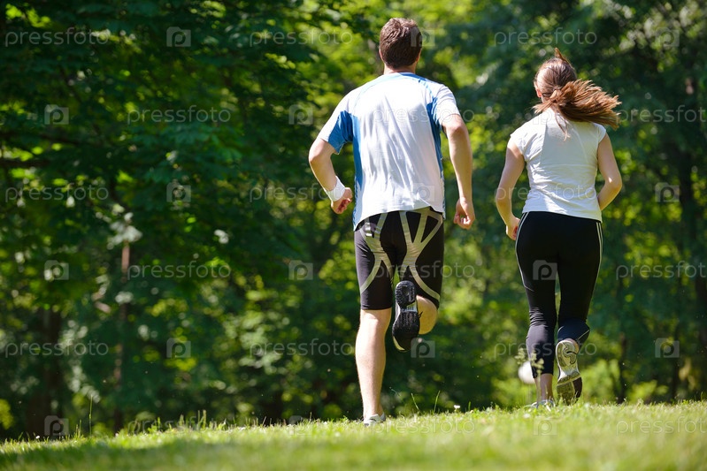 Молодая пара на утренней пробежке в парке. Здоровье и фитнес