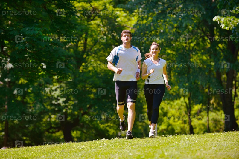 Молодая пара на утренней пробежке в парке. Здоровье и фитнес
