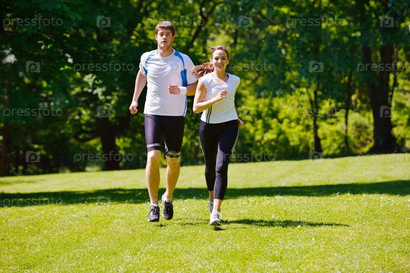 Молодая пара на утренней пробежке в парке. Здоровье и фитнес