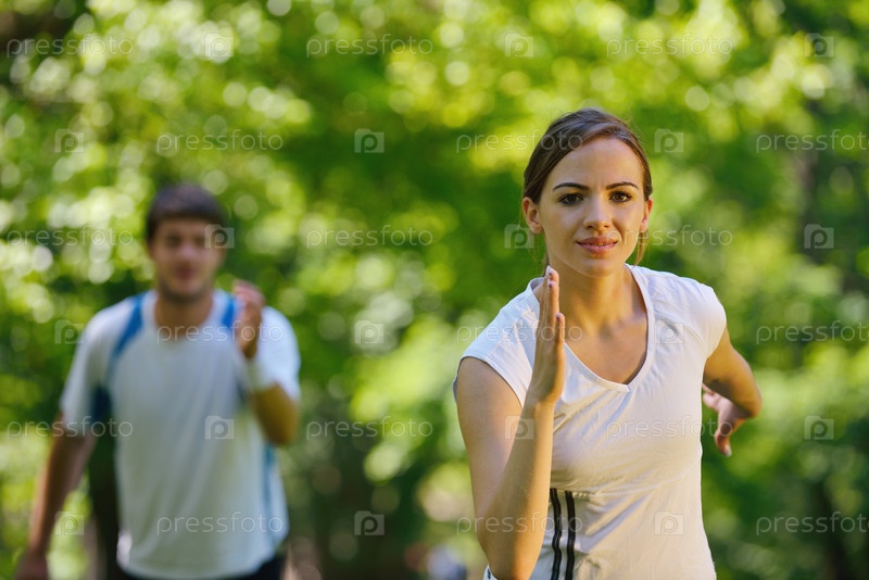 Молодая пара на утренней пробежке в парке. Здоровье и фитнес