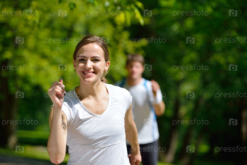 Молодая пара на утренней пробежке в парке