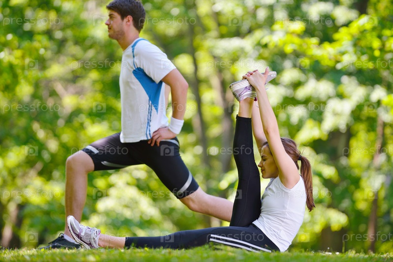 Молодая пара выполняет упражнения после пробежки на открытом воздухе в парке