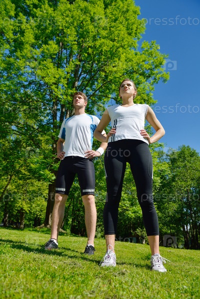 Молодая здоровая пара делает расслабляющие упражнения расслабления на растяжку после пробежки в парке