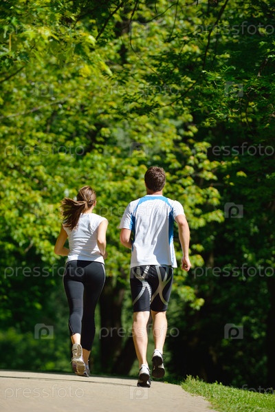 Молодая пара на утренней пробежке в парке. Здоровье и фитнес