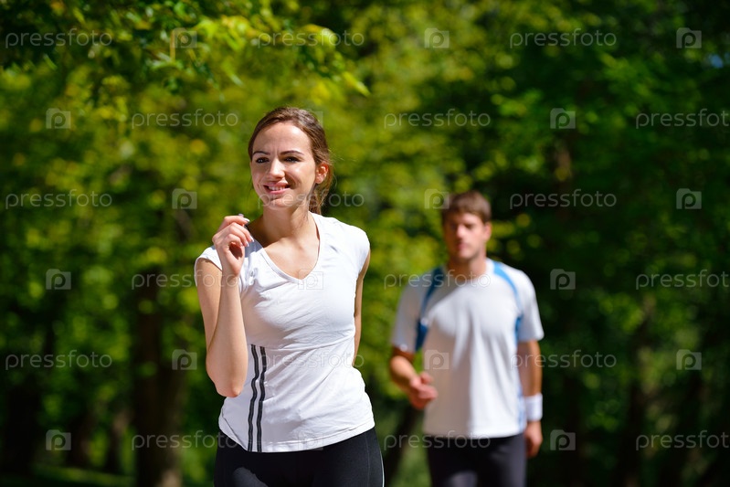 Молодая пара на утренней пробежке в парке. Здоровье и фитнес
