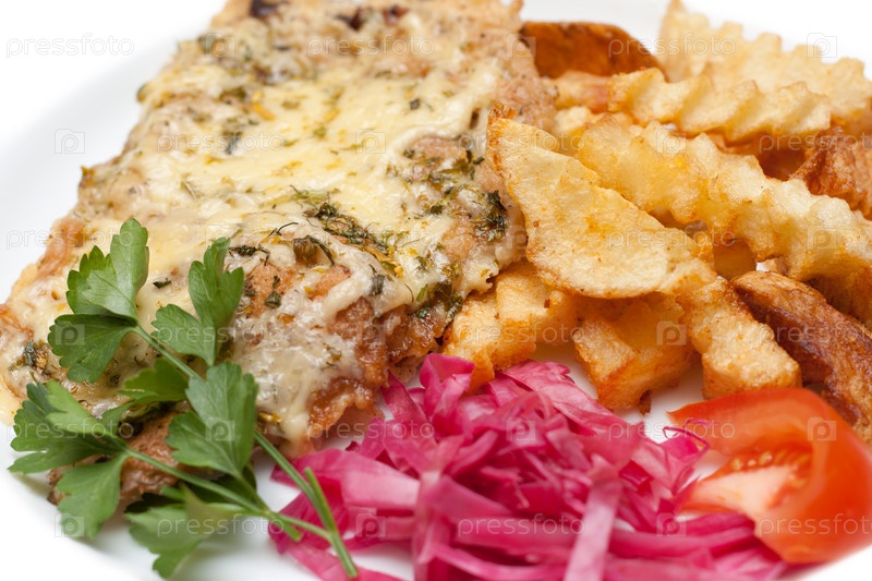 Жареное мясо в сыром, картофелем и салатом