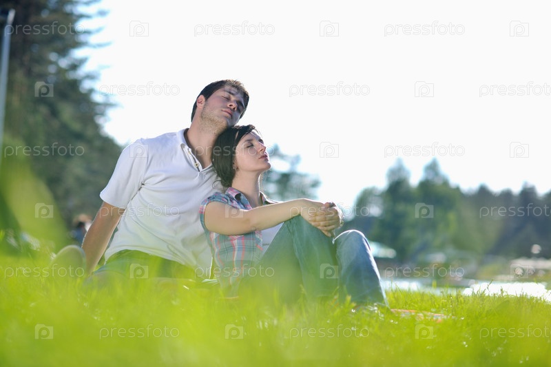 Счастливая молодая влюбленная пара на летнем пикнике
