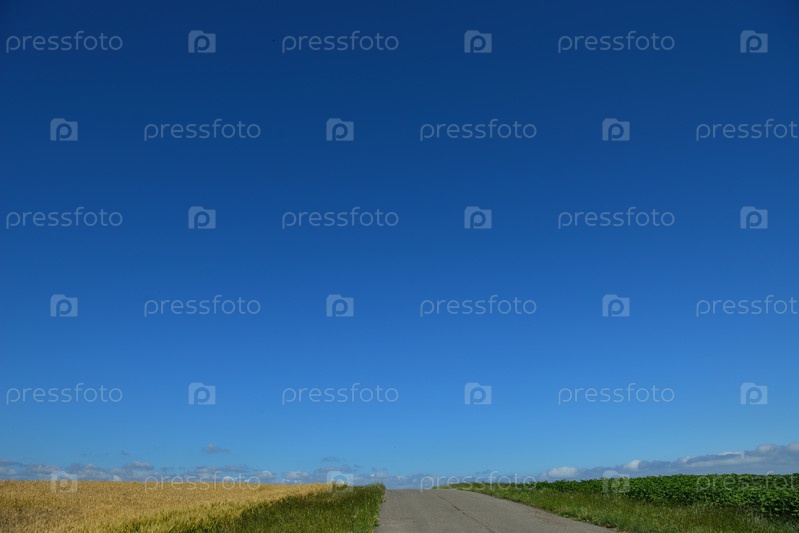 Поле золотой пшеницы и дорога на фоне голубого неба