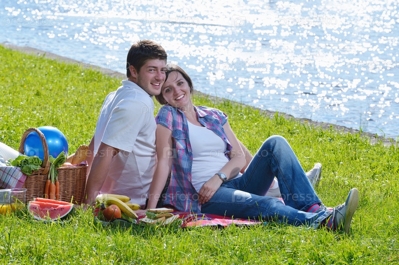 Счастливая молодая влюбленная пара на летнем пикнике