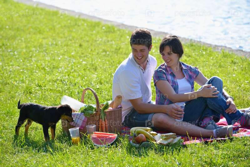 Счастливая молодая влюбленная пара на летнем пикнике