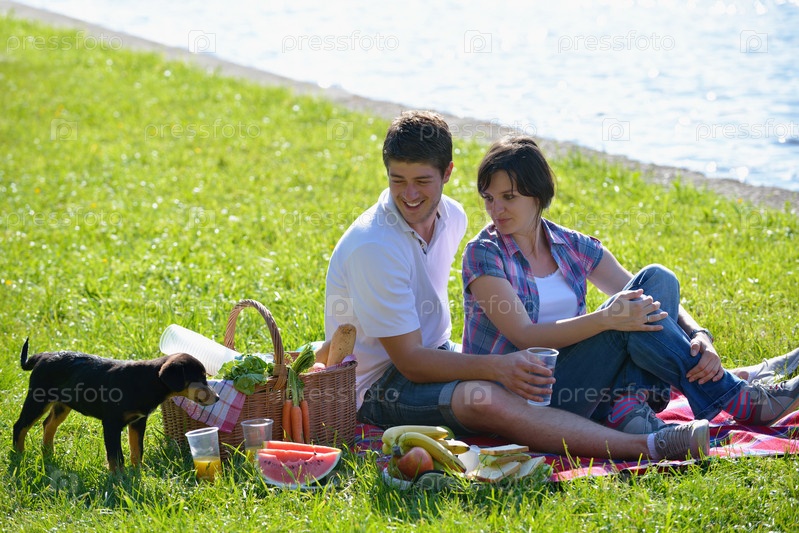 Счастливая молодая влюбленная пара на летнем пикнике