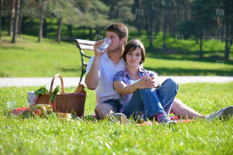 Счастливая молодая влюбленная пара на летнем пикнике