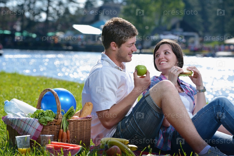 Счастливая молодая пара на пикнике летом