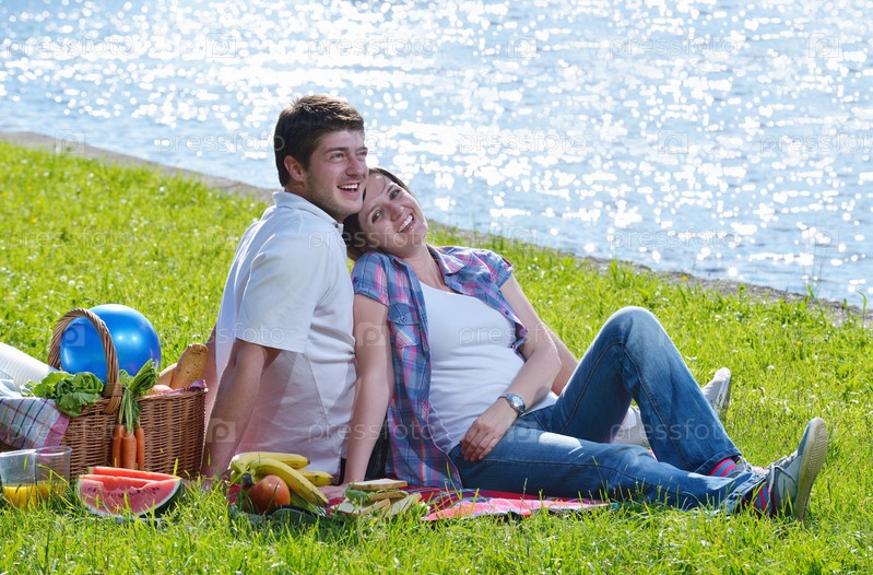 Счастливая молодая пара на пикнике летом
