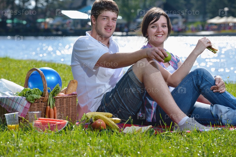 Счастливая молодая пара на пикнике летом