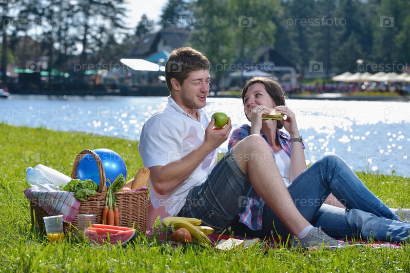 Счастливая молодая пара на пикнике летом