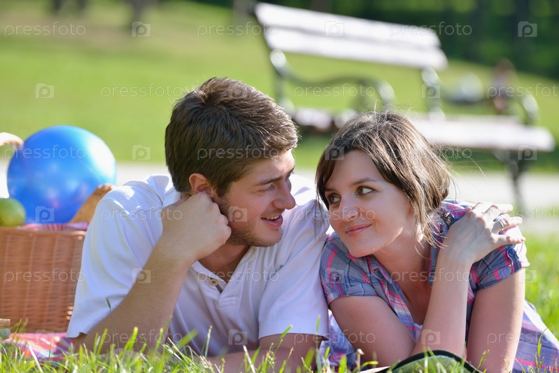 Счастливая молодая влюбленная пара на летнем пикнике