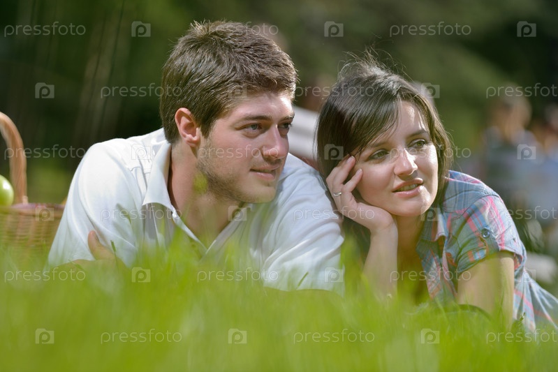 Счастливая молодая влюбленная пара на летнем пикнике