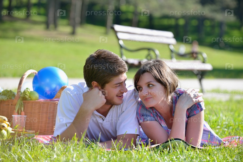 Счастливая молодая влюбленная пара на летнем пикнике