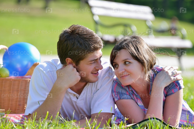 Счастливая молодая влюбленная пара на летнем пикнике