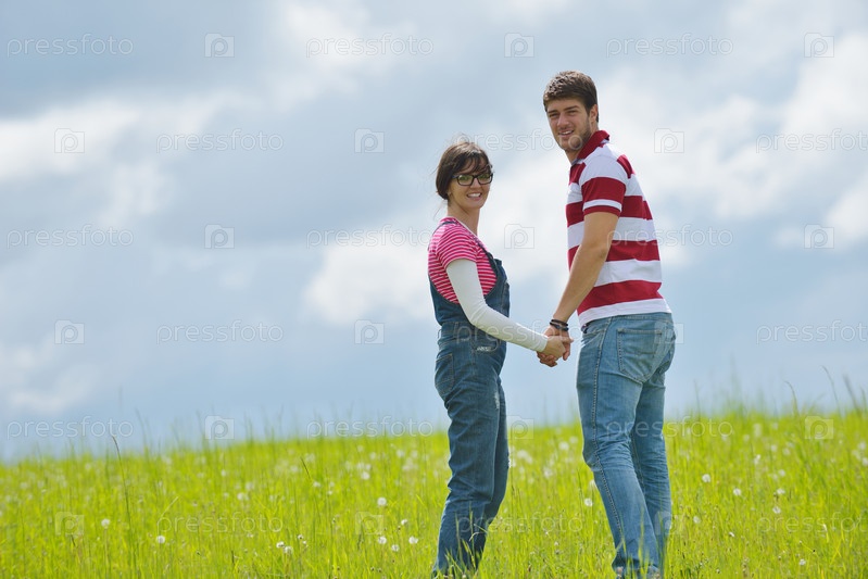 Счастливая молодая влюбленная пара на свежем воздухе на фоне неба