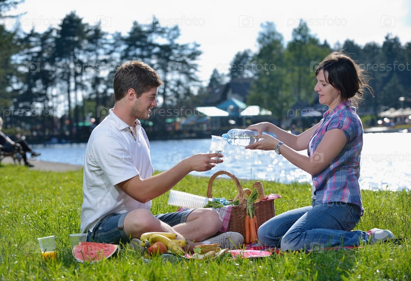 Счастливая молодая влюбленная пара на летнем пикнике