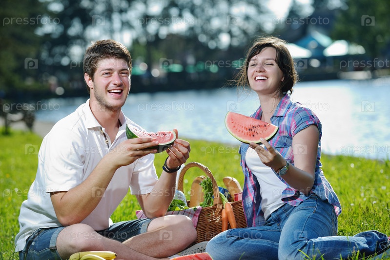 Счастливая молодая влюбленная пара на летнем пикнике