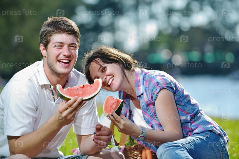 Счастливая молодая влюбленная пара на летнем пикнике