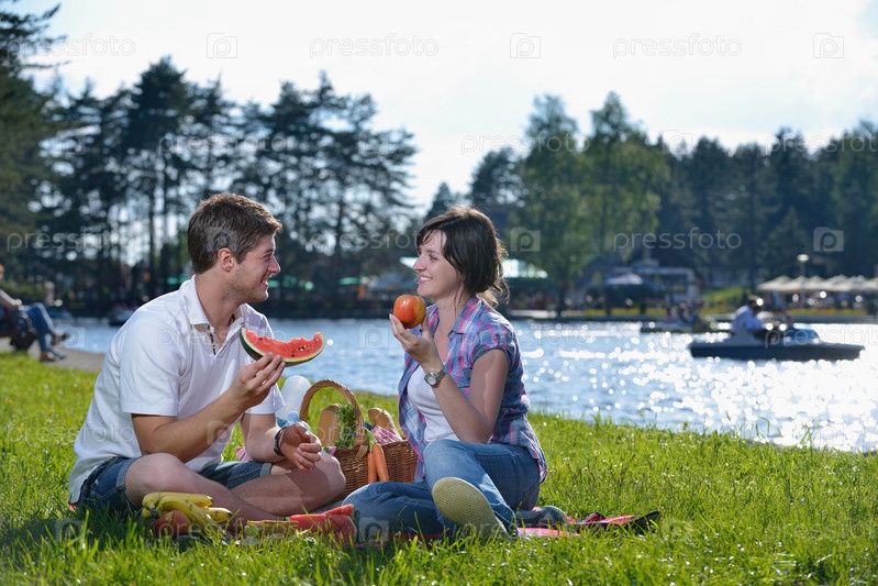 Счастливая молодая влюбленная пара на летнем пикнике