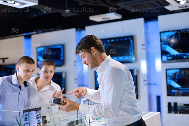 Молодая пара в магазине электроники рассматривает технику перед покупкой