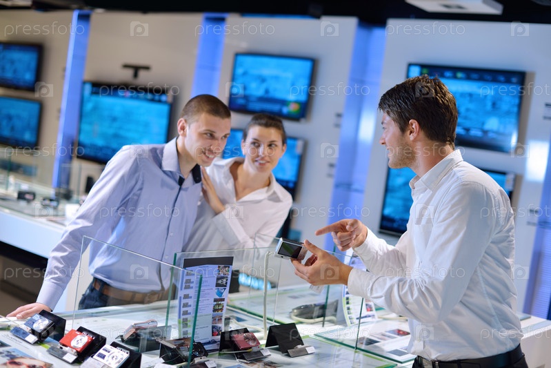 Молодая пара в магазине электроники рассматривает технику перед покупкой