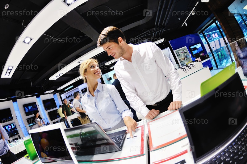 Молодая пара в магазине электроники рассматривает технику перед покупкой