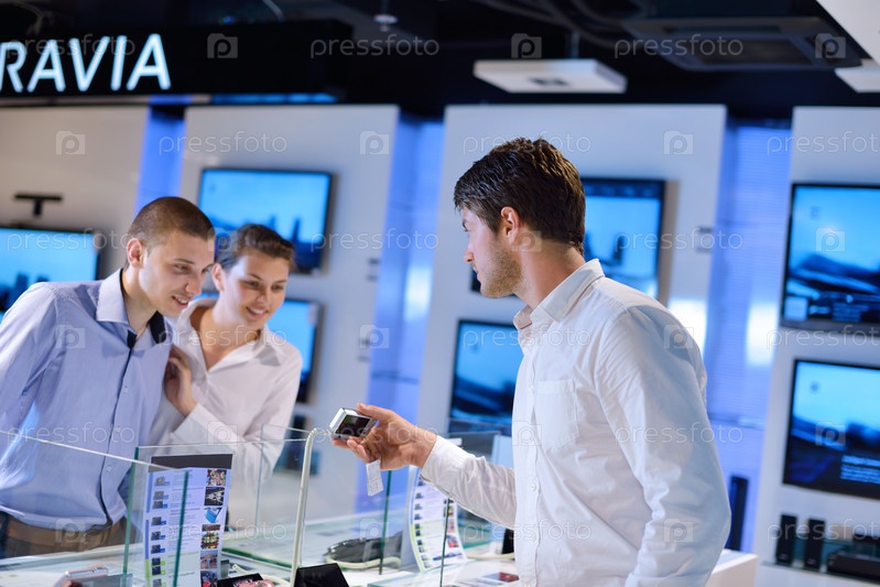 Молодая пара в магазине электроники рассматривает технику перед покупкой
