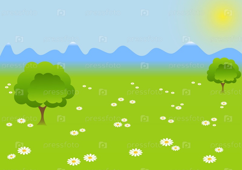 Зеленое цветочное поле и горы, летний солнечный пейзаж
