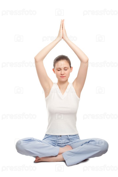 Женщина медитирует, изолирована на белом фоне