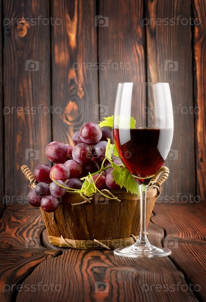 Бокал вина и виноград в корзине на деревянном фоне
