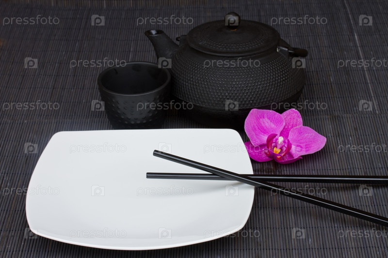 Пустая тарелка с палочками и сервиз для чая
