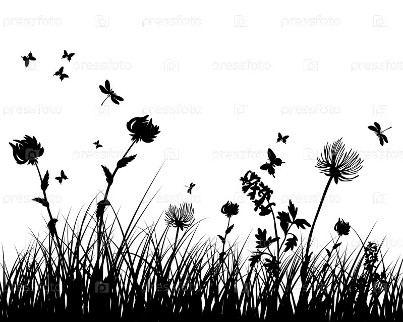 Силуэты травы и цветов на белом фоне
