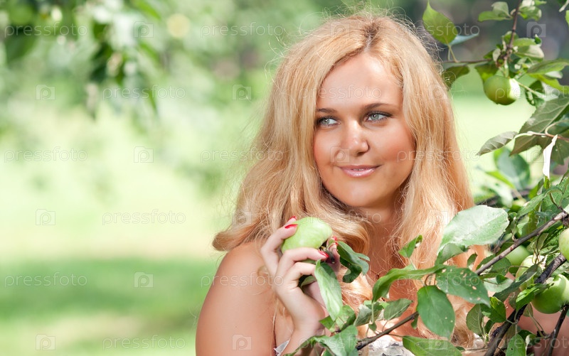 Улыбающаяся женщина собирает зеленые яблоки