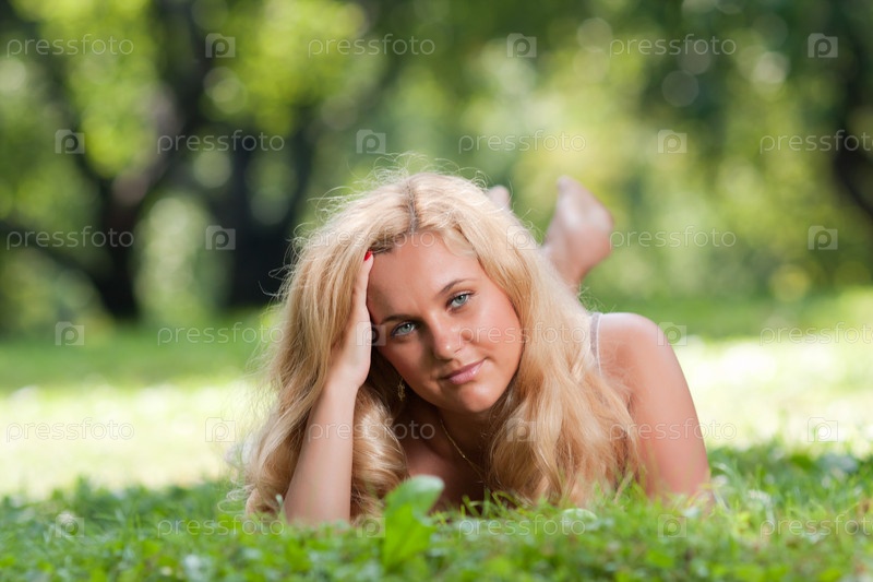 Красивая блондинка отдыхает на траве