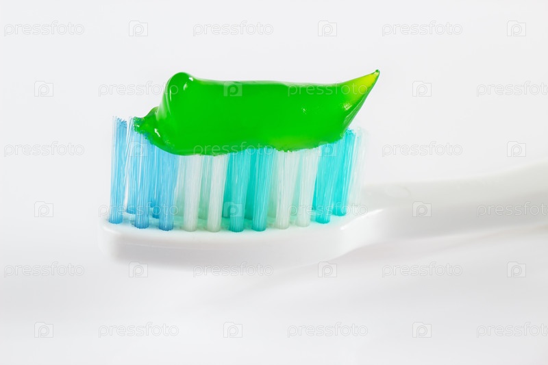 Зубная щетка с зеленой зубной пастой на белом фоне