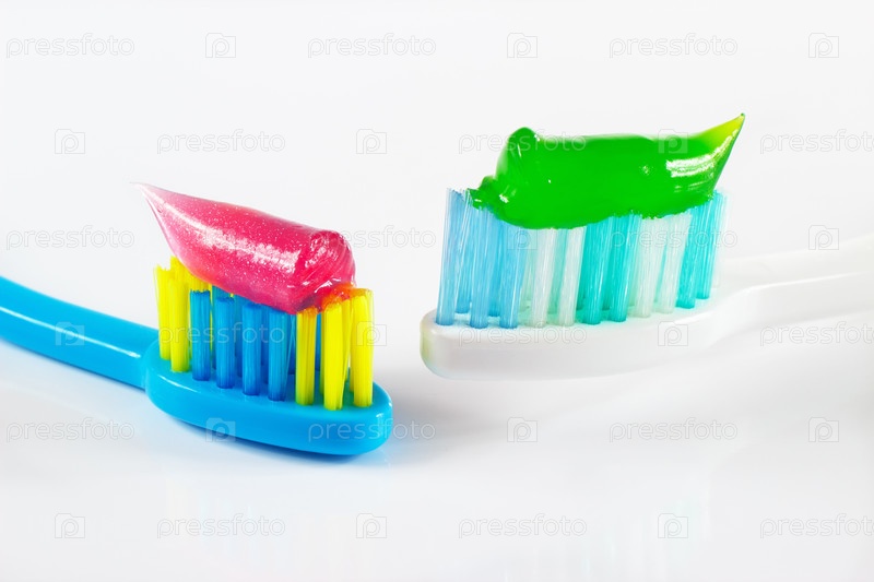 Зубные щетки с розовойц и зеленоц зубной пастой на белом фоне