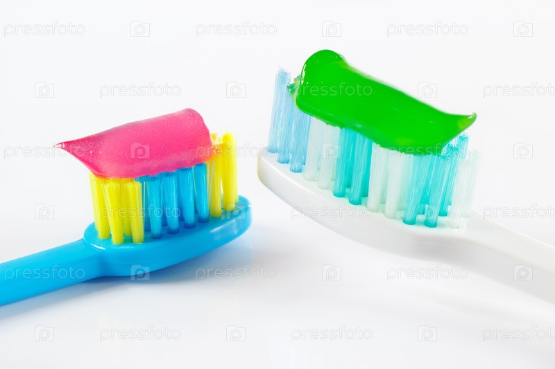 Белая и синяя зубная щетка с зубной пастой на белом фоне
