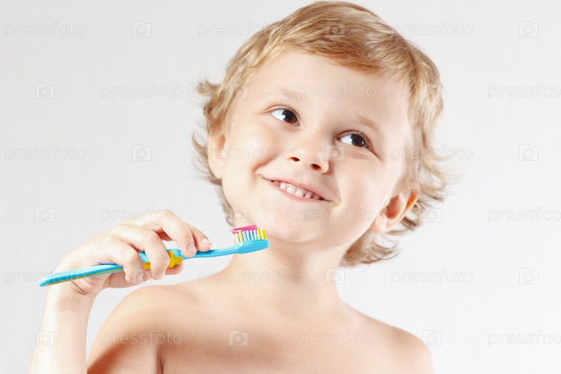 Маленький милый белокурый мальчик с зубной щеткой на белом фоне