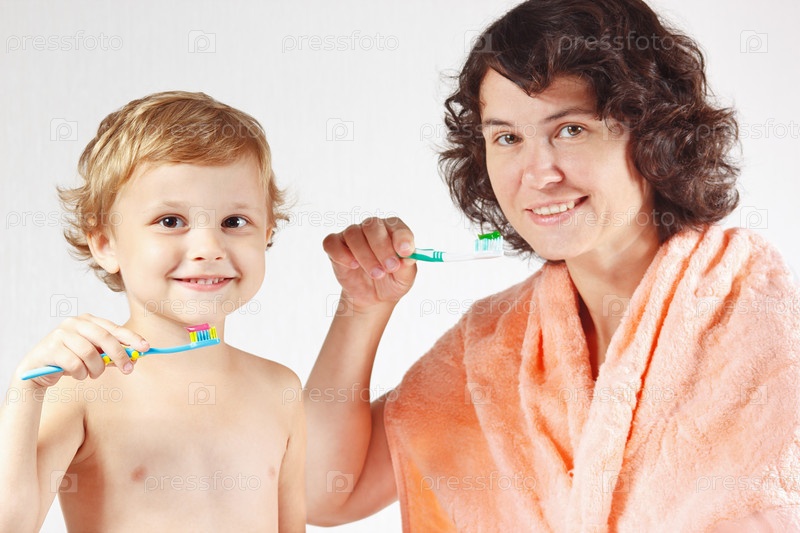 Маленький мальчик с матерью чистят зубы на белом фоне